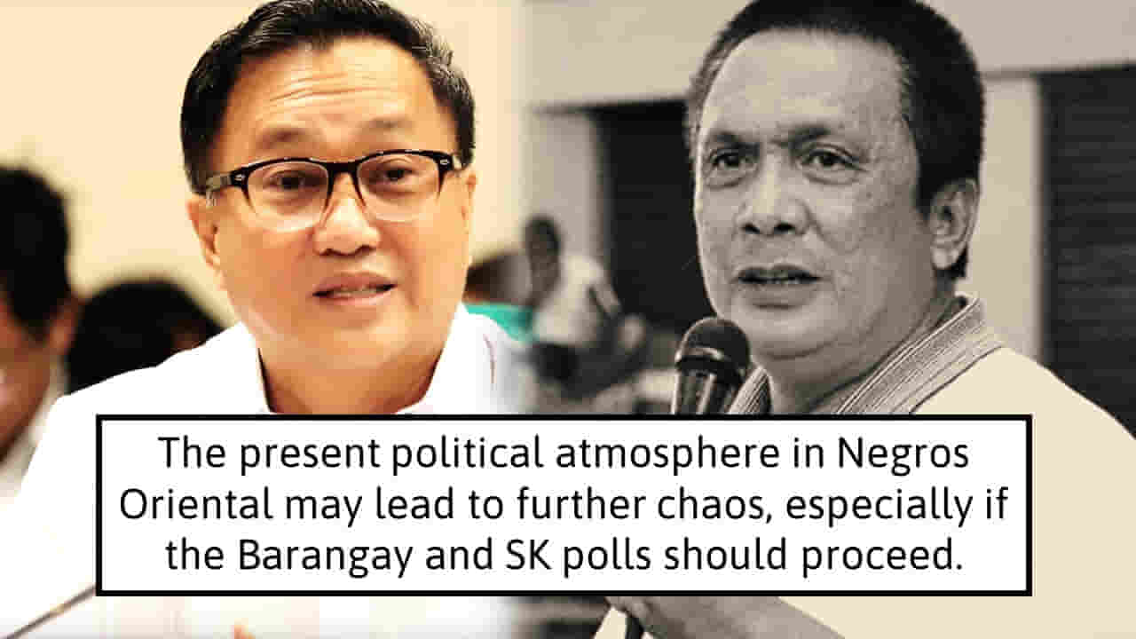 Tolentino, chairman of the Senate Committee on Justice and Human Rights, warned that the present political atmosphere in Negros Oriental may lead to further chaos, especially if the Barangay and SK polls should proceed in the province this coming last week of October.